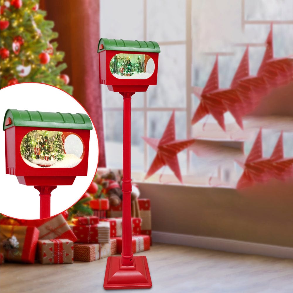 The mailbox is illuminated with bright, festive lights that enhance its visual appeal, while the built-in music plays cheerful holiday tunes, adding to the festive atmosphere. The snow effect creates a whimsical touch, making it appear as though it's gently snowing, adding a dynamic element to your indoor holiday displays.
