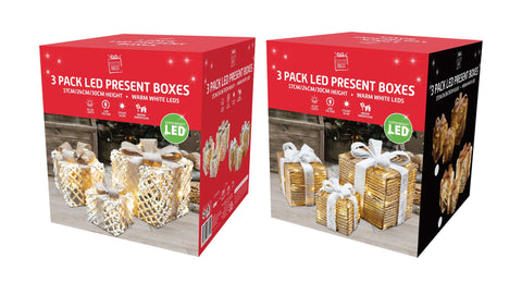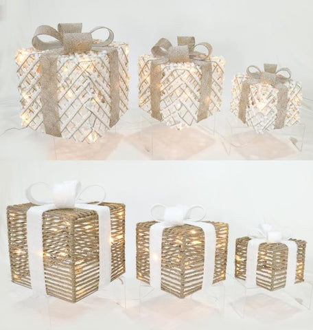 This charming set of three assorted presents combines natural materials with warm LED illumination to create a festive and sophisticated display.