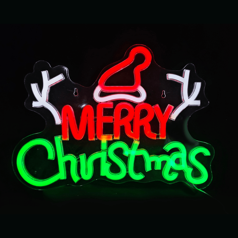 - Add a fun and festive glow to your celebrations with this eye-catching sign, featuring a cheerful “Merry Christmas” design topped with playful antlers.