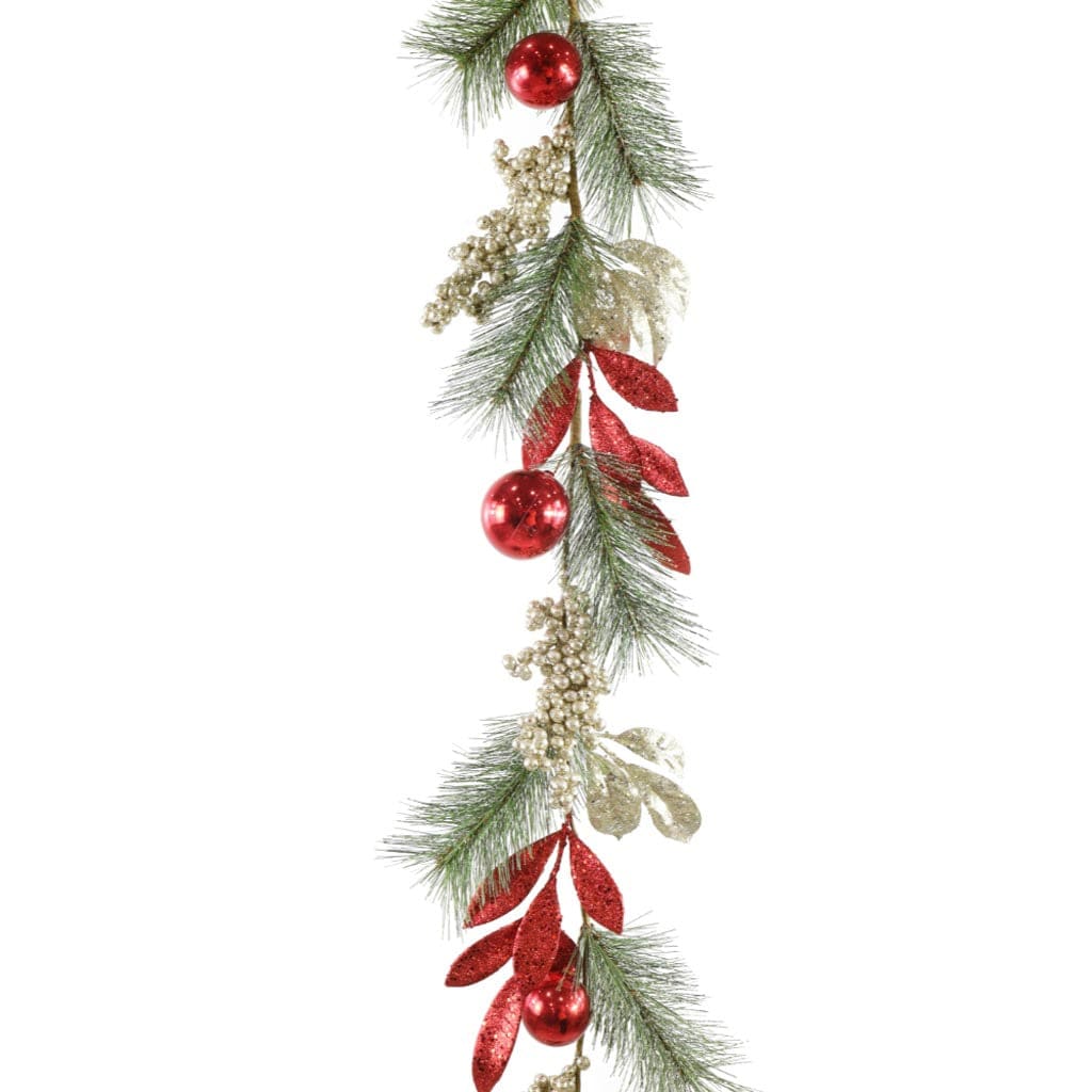 - Wired Natural Branches with Pine Leaves, Red Gloss Baubles and Leaves with Gold Berry Accents