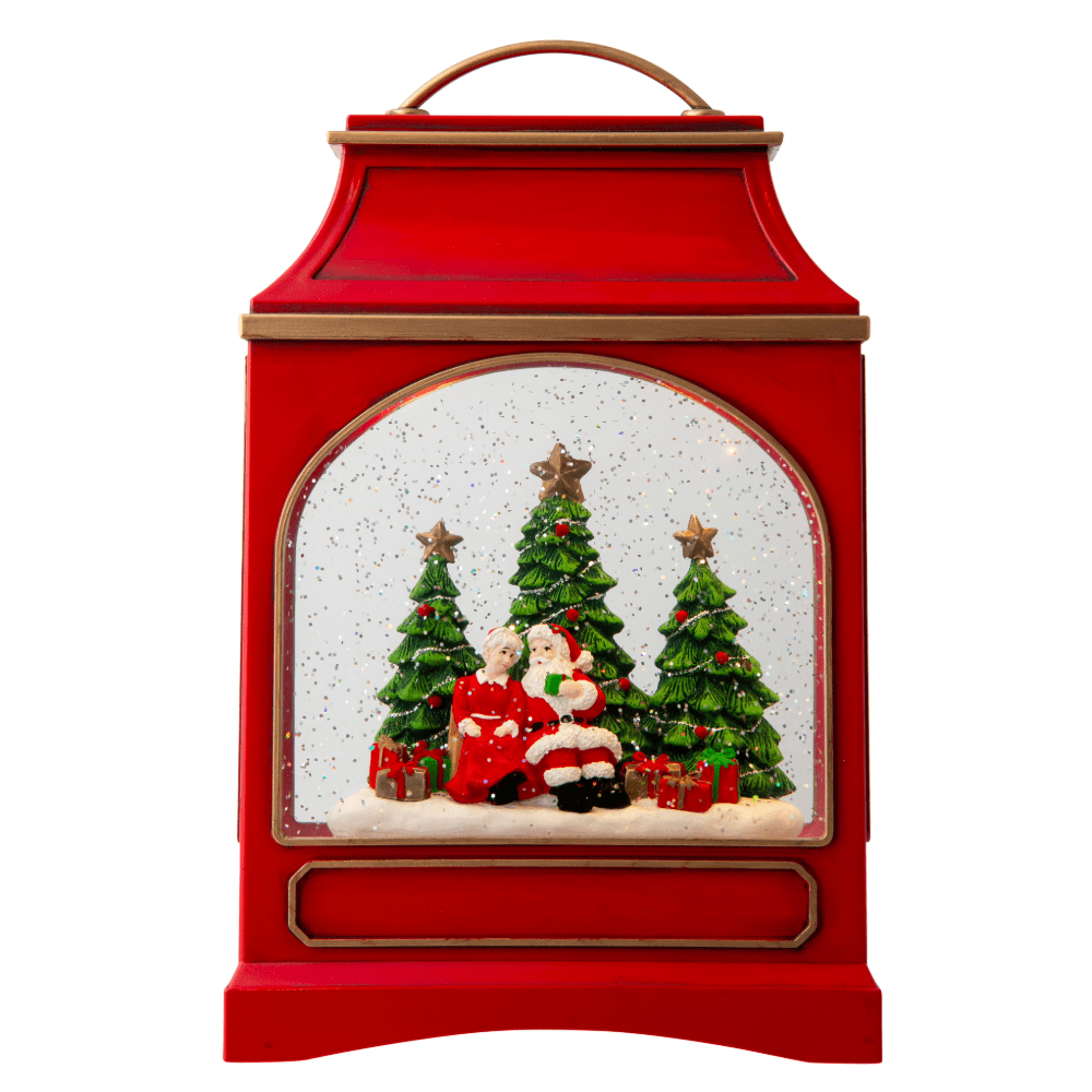 With swirling glitter that dances around them, this Lantern brings their magical moment to life, creating a mesmerizing display that fills your space with joy and nostalgia. Whether placed under the tree as a focal point or displayed on your mantle as a cherished centerpiece, this Lantern serves as a beautiful reminder of the true meaning of the season - love, togetherness, and the anticipation of joyous moments yet to unfold. Let Santa and Mrs. Claus light up your holidays and fill your heart with the magic of Christmas.