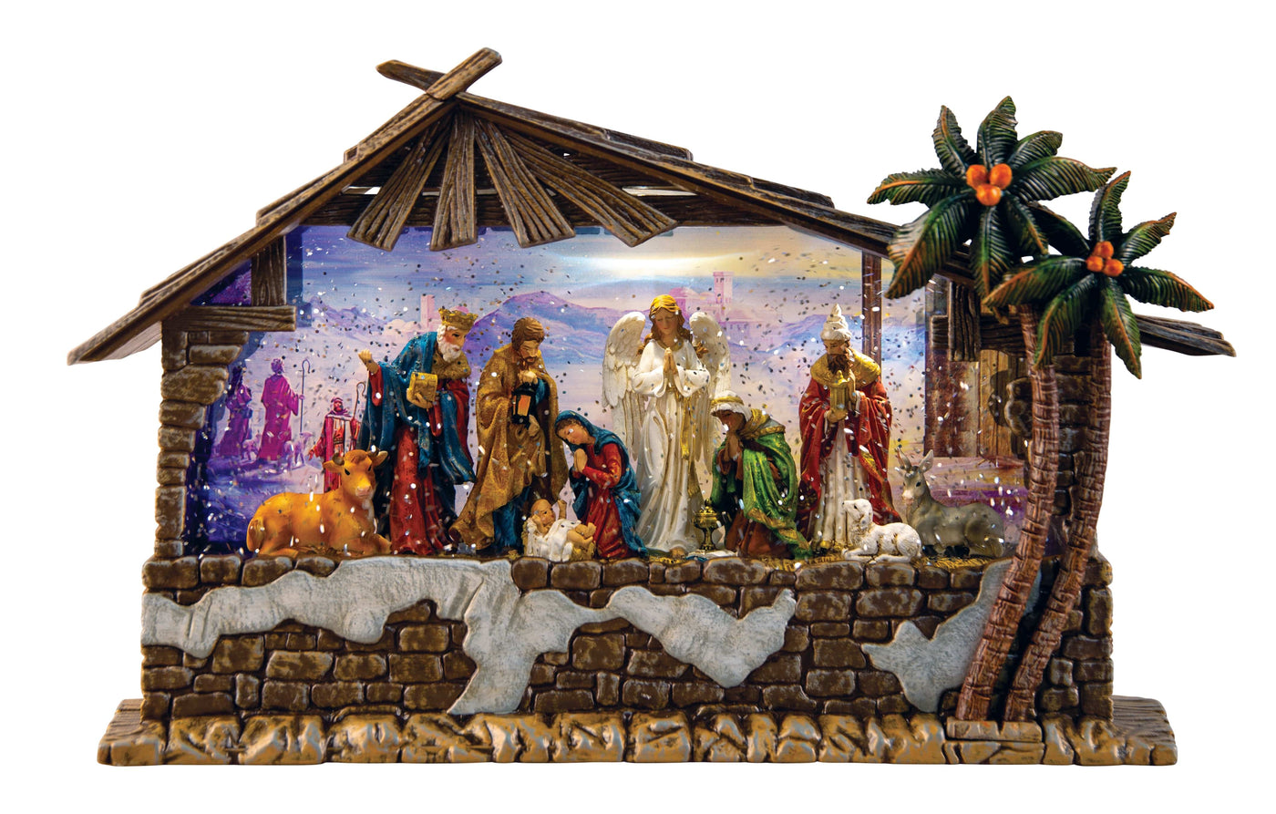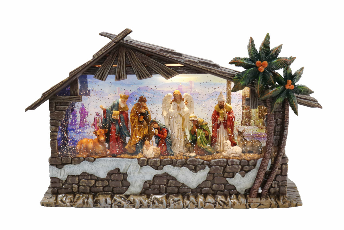 - Stunning Musical Nativity Scene featuring 11 Figurines with a beautiful Glitter Swirl effect