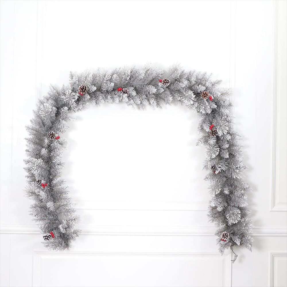 Enhance your seasonal décor with the elegant White Arrow Tip Berries Garland. This beautifully crafted garland is adorned with clusters of berries nestled among frosted tips, adding a festive touch and a natural wintery charm to any space.