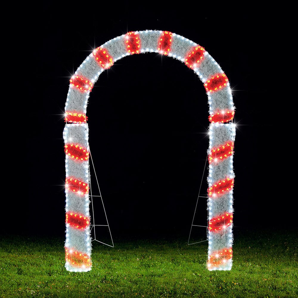 The LED Tinsel Ropelight Twinkling Candy Cane Arch features a classic candy cane shaped arch adorned with twinkling LED lights and shimmering tinsel, creating a dazzling and eye-catching effect.