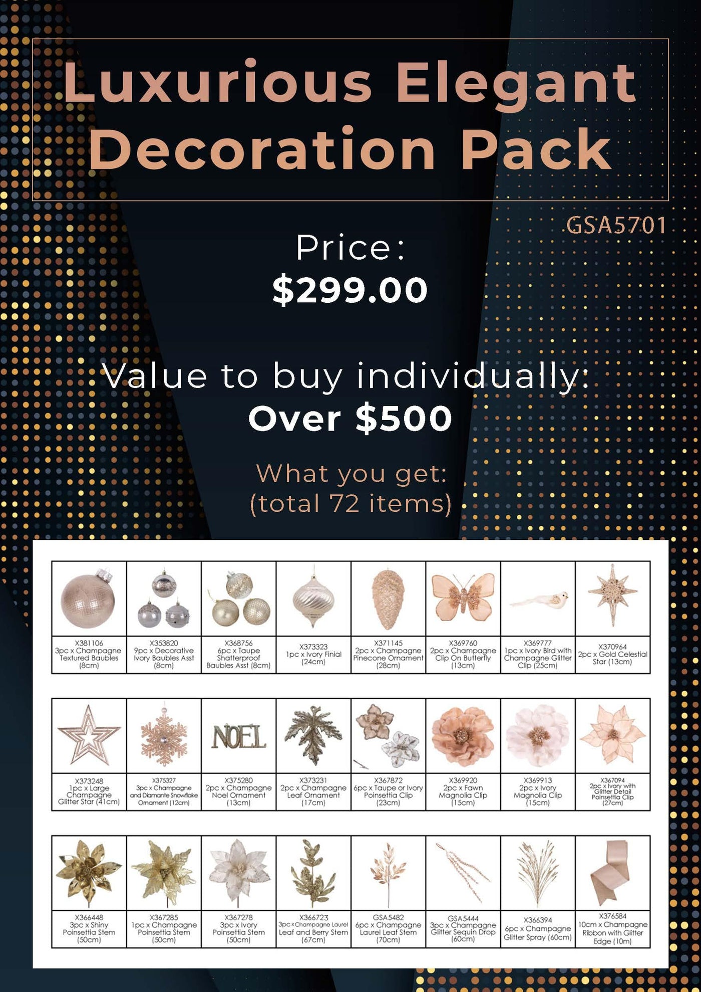 Drape your Christmas in timeless sophistication with our Luxurious Elegance Decoration Pack.