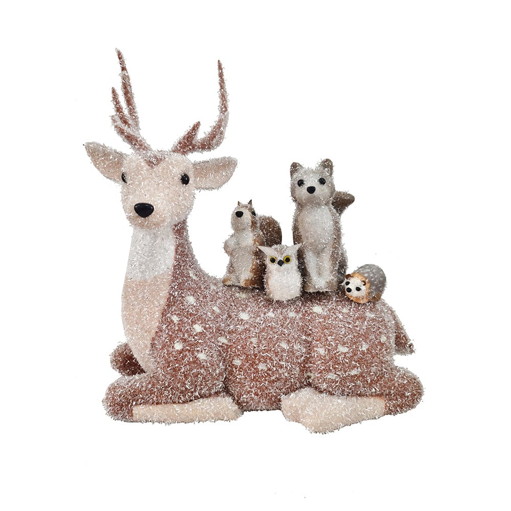 Meet our Glitter Sitting Deer with Critters, a whimsical blend of woodland charm and festive sparkle.